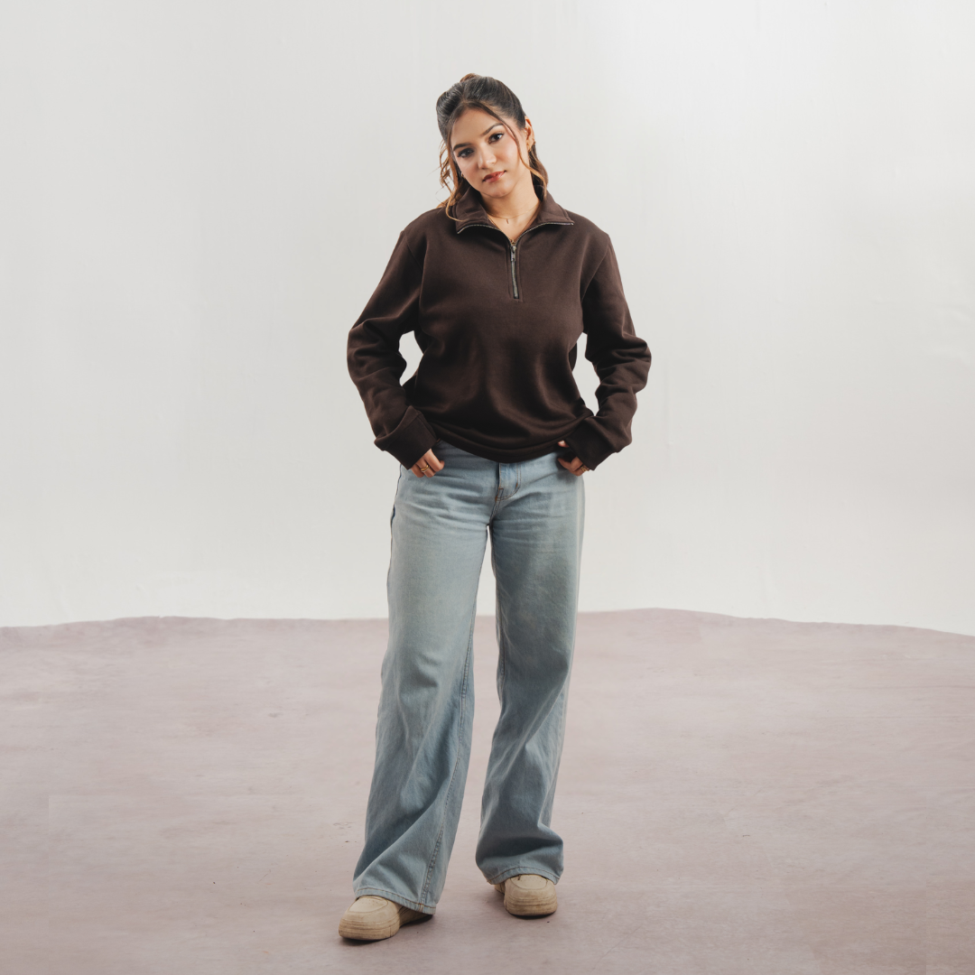 A unisex layer in mid-weight cotton fleece with a smooth metal half-zip. Structured yet easy, made for layering or wearing alone. High neck, straight fit, and subtle detail in texture and tone.